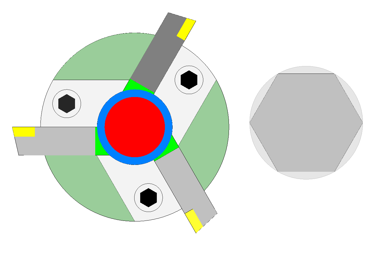 下面是一張車方機(jī)利用飛刀盤加工六方工件的原理圖,動(dòng)力頭帶動(dòng)飛刀盤與工件保持2:1的轉(zhuǎn)速,這樣六方的六個(gè)面就一次成型了。很多用戶擔(dān)心這種加工方式刀片的磨損情況。我司在車方機(jī)的研發(fā)生產(chǎn)上已經(jīng)有多年的經(jīng)驗(yàn),在刀片的使用及注意事項(xiàng)上也有很深的研究,刀片需要根據(jù)材質(zhì)選擇適當(dāng)?shù)能嚨,?dāng)然材質(zhì)越好的刀片磨損越慢,這就需要對(duì)工件進(jìn)行綜合考量,選擇最具性價(jià)比的刀片。在切削液的選擇上很多用戶陷入了誤區(qū),這種斷續(xù)切削如果用普通的水基切削液,會(huì)大大減少刀具的使用壽命。斷續(xù)切削最宜使用的切削液是油基的,這也是我們總結(jié)出來(lái)的經(jīng)驗(yàn)。